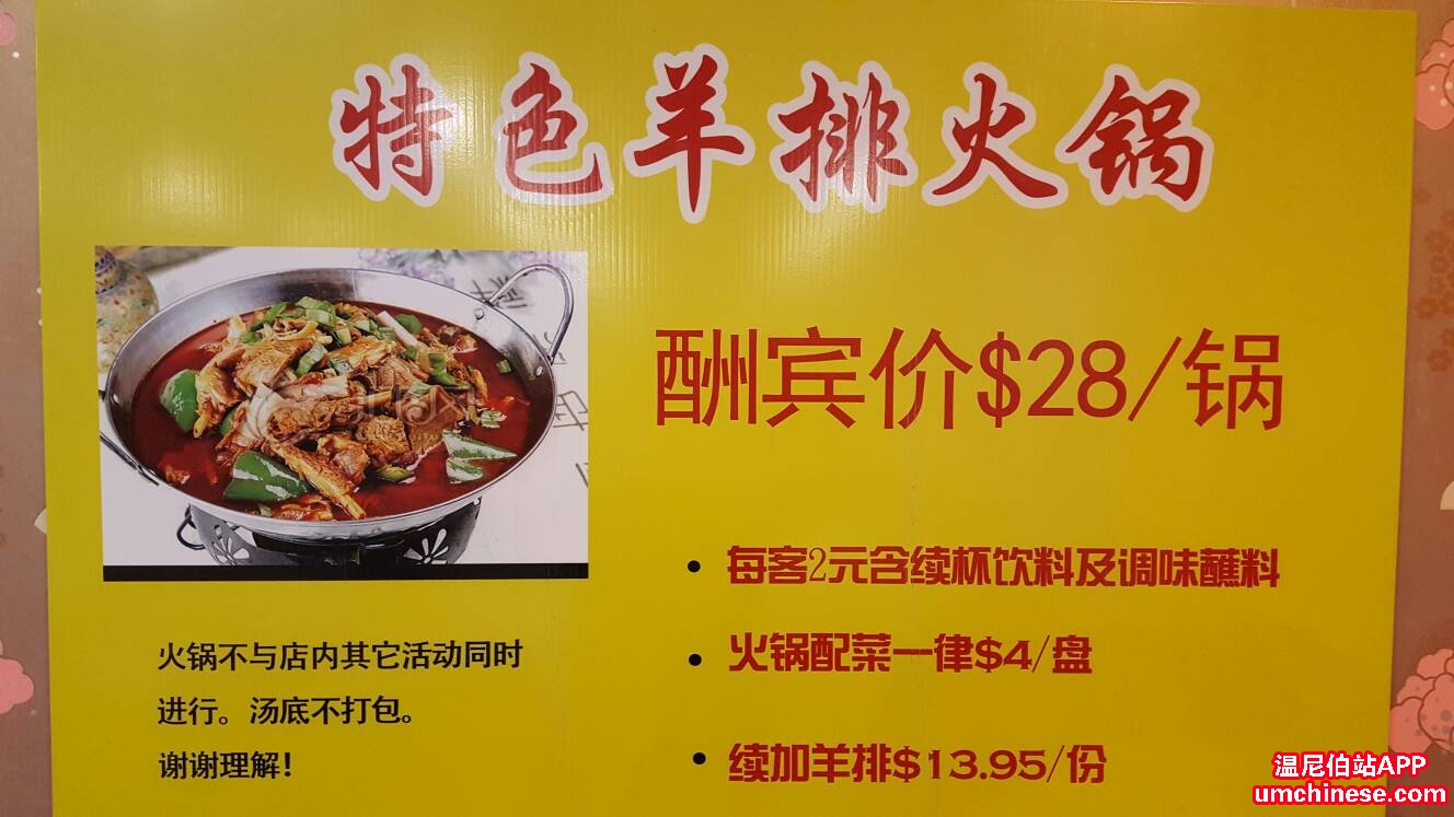 浓浓的一锅红汤,满满的一锅羊排。 配菜自选,丰俭由己。 应广大顾客要求,堂吃税前满50元,赠送店内任何菜品的活动继续进行。(火锅不在活动范围)