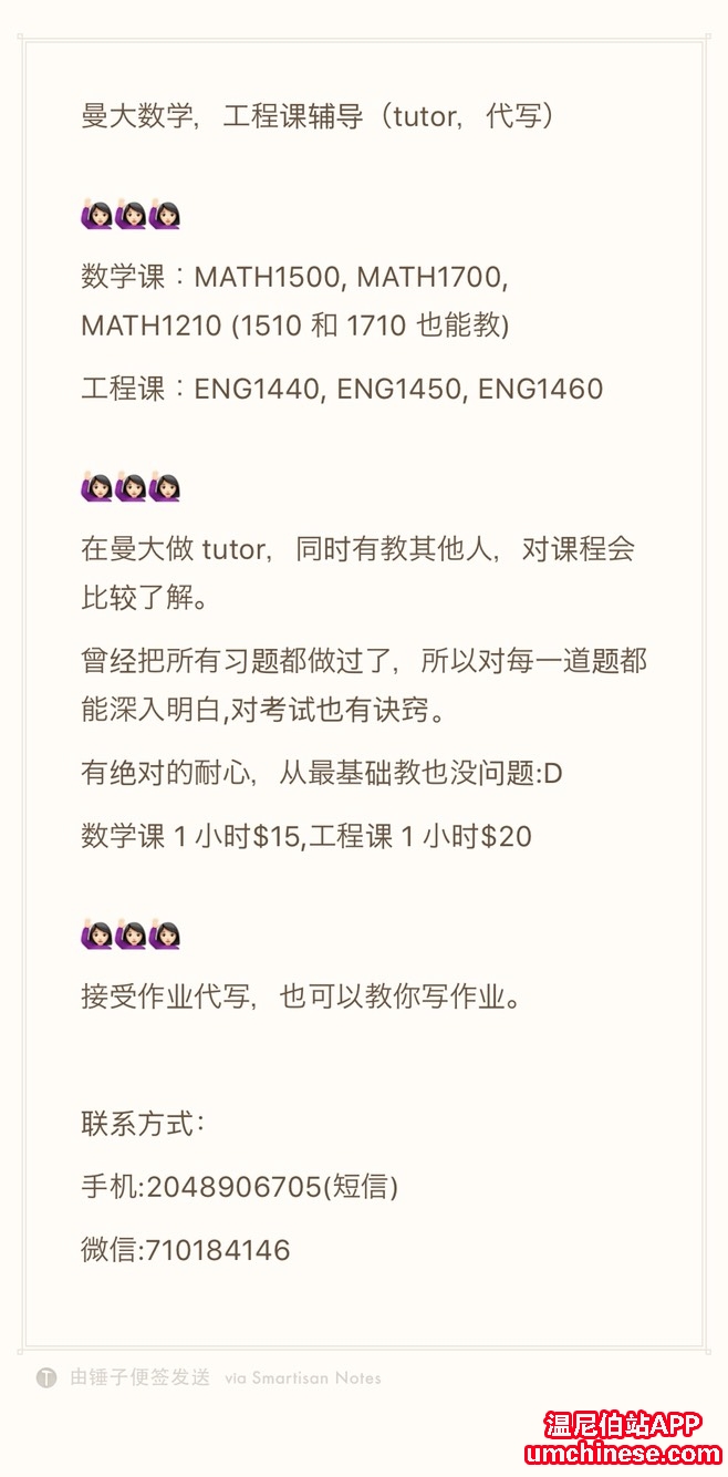 数学课:MATH1500, MATH1700, MATH1210 (1510和1710也能教) 工程课:ENG1460 (1440和1450也可以) 在曼大做tutor,同时有教其他人,对课程会比较了解。 曾经把所有习题都做过了,所以对每一道题都能深入明白,对概念 ...