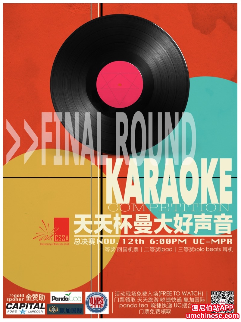 看过来看过来!天天杯曼大好声音决赛将于本周六(11月12日)下午6:00在UC-MPR开战!现已开启免费门票发放活动只需在本周前往天天旅游、赢加移民、晓捷快递、panda tea和UC摆台处即可领取免费门票感谢天天旅游,ONPS,p ...