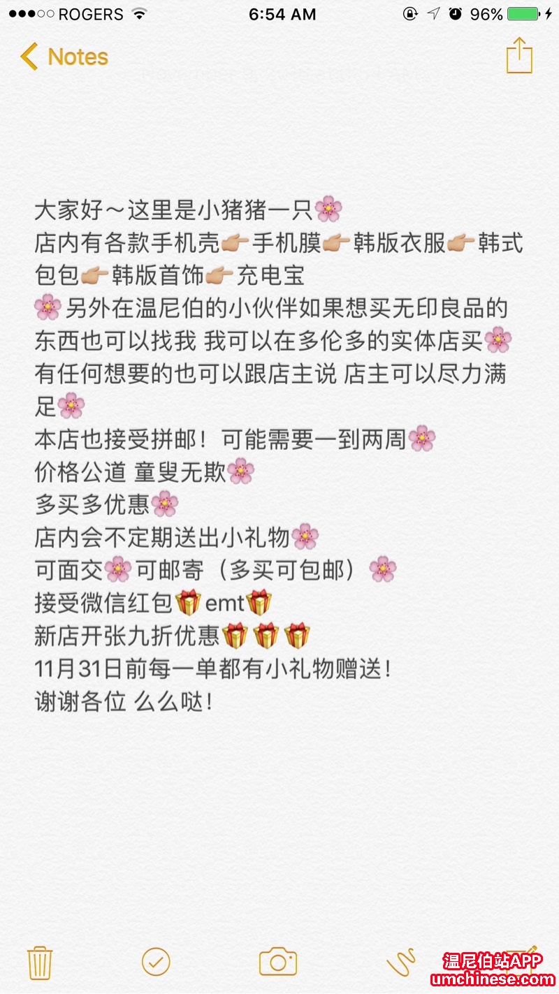 这里是在温尼伯卖手机壳手机配件的小猪一只~ 偶尔更新韩式衣服首饰~ 支持拼邮~ 所有货需要一到两周~心急的宝宝慎买! 在温尼伯的宝宝们可以选择面交也可以选择直接邮寄到家(从多伦多)~邮费一般自付 多买可包 ...