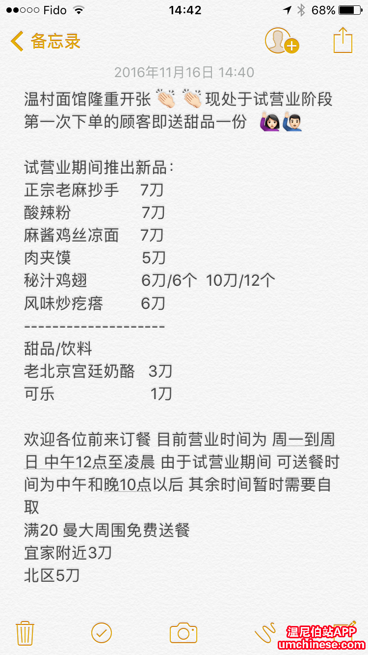 温村面馆周四开始试营业 订餐就送甜品一份~欢迎同学们提前订餐 现在全天可以送餐 如果特殊情况 请微信联系~ 取餐地址 700 Allegheny Drive
