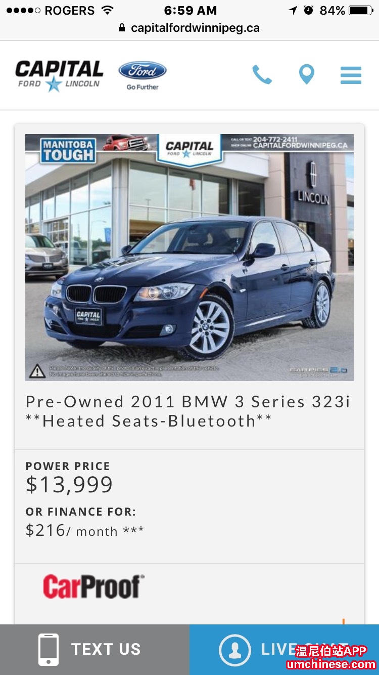 2011年BMW 323i 蓝牙 加热座椅 天窗等一应俱全 超低公里数! 80373km! 仅售:$13999 话不多说! 赶紧上图! 感兴趣的朋友可千万别等咯! 别忘咯!我是Capital Ford Lincoln的华人销售顾问Ricky 本店紧邻Polopark s ...