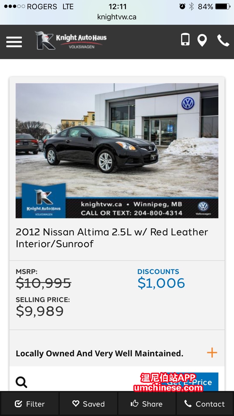 2012 年尼桑双门天籁,红色内饰,真皮座椅,双区恒温,座椅加热,电动座椅,天窗,倒车影像,十七万公里但保养的非常好,车况也非常好。而且红色内饰非常少有,欢迎大家打电话给我预约过来试驾。 Pembina大众销售: ...