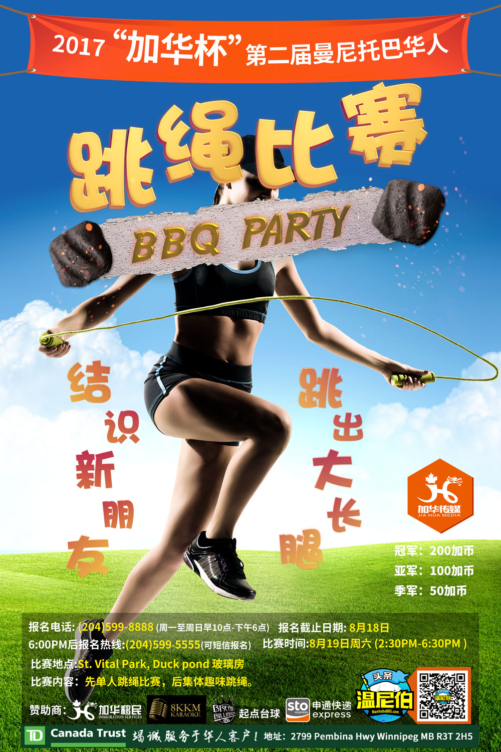 温尼伯第二届大型公益烧烤活动将于8月19日开展。本次活动集娱乐、运动和免费餐饮于一体,完完全全的温尼伯欢乐大聚会! 2017年“加华杯”第二届曼省华人跳绳比赛现在开始报名啦! 奖金、奖品和免费烧烤饮料在向你 ...