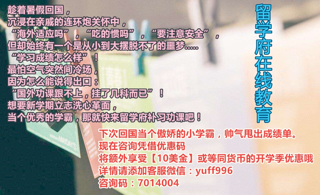 所有人都在关心你飞的高不高, 却没有人关系你飞的累不累。 海外留学是飞往梦想、 飞往光明大道的捷径, 但这条留学路却也没有想象中的轻松。 去到国外,教学模式不适应, 功课跟不上,学业总挂科重修, 这些都在打击着你的自信心, 多想说一声:“留学其实很辛苦”。 而它懂你的累, 留学府注于留学生一对一量身定制在线教育, 帮助你快速提高学习成绩, 还能与海外顶尖名校数百名学霸交流学习经验。 即日起至9月30日在留学府 消费满指定金额还可获赠现金抵扣券。 现在咨询凭借优惠码 将额外享受【10美金】或等同货币的开学季优惠哦, 详情请添加客服微信:yuff996 咨询码:7014004 ![]() |