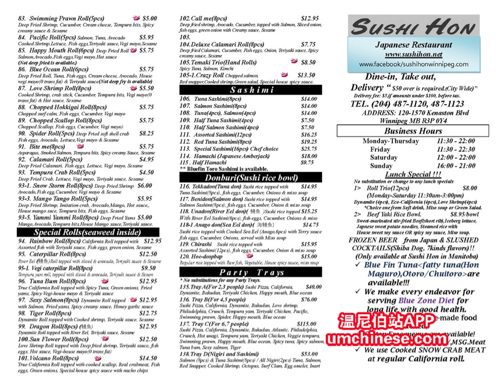 kenaston 寿司店欢迎您的光顾 八年老店寿司 希望大家有空来就餐 价格亲民 欢迎各位来店内就餐或者拨打电话订餐 120-1570 kenaston blvd (kenaston cibc旁边) www.sushihon.net facebook:sushihon winni ...