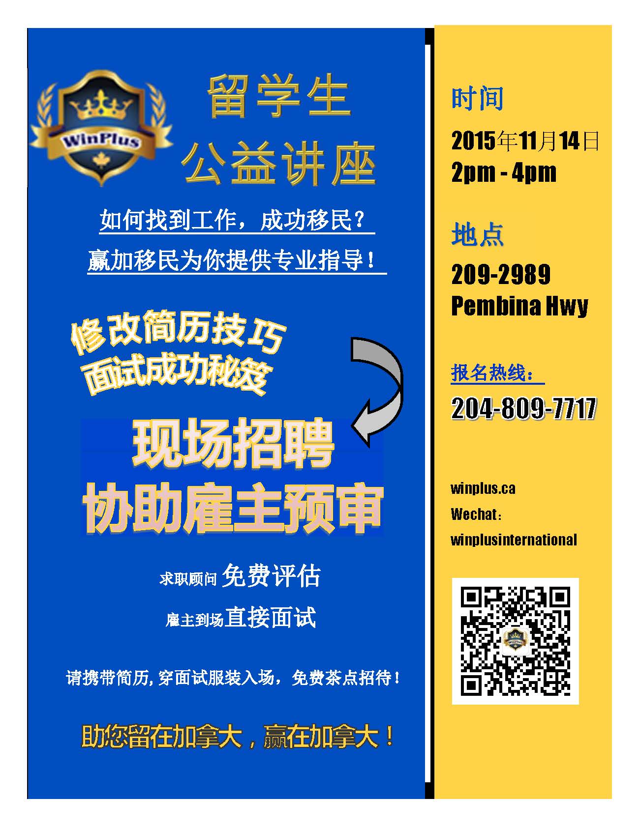 本帖最后由 赢加留学移民 于 2015-11-12 11:22 编辑 重大消息:赢加留学移民将在11月14日举办留学生的专题公益讲座+现场招聘!座位有限,30个名额报完为止,快拨打204-809-7717报名吧! 为留学生量身定做的 ...
