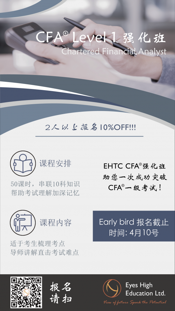 CFA Level 1 强化班 强势来袭!!!Eyes High Education (EHTC)即日起正式开班!所谓技多不压身!多一张证书而又何尝不可!!!小班教学,系统学习,专业的导师进行指导!课后还有答疑服务!想要了解更多消息!请 ...