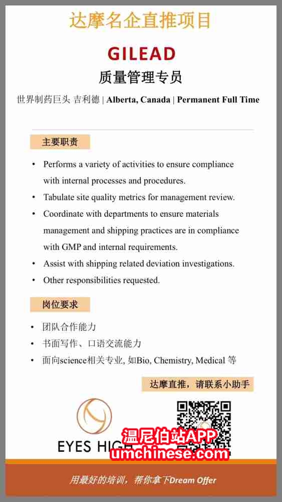 【达摩直推】制药巨头Gilead 吉利德 QA部门| Alberta 地区 两个full time permanent工作机会 面向Science相关专业,有bio, chemistry,medical等相关背景的朋友都可以申请 需要推荐的朋友请尽快扫码联系小助手 ...