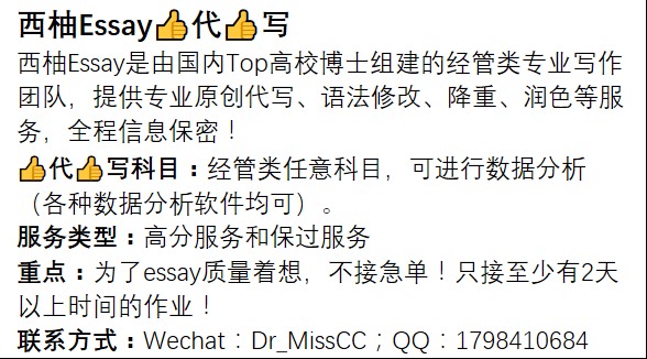 西柚Essay是由国内Top高校博士组建的经管类专业写作团队,提供专业原创代写、语法修改、降重、润色等服务,全程信息保密。 代写科目:经管类任意科目,可进行数据分析(各种数据分析软件均可)。 服务类型:高分服务 ...