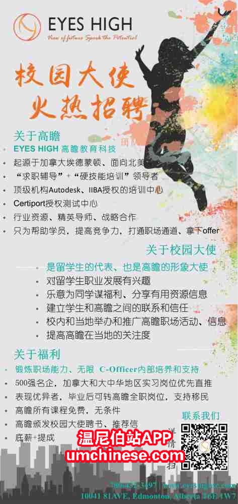 EyesHigh 诚聘校园大使! 学生工作机会! 请感兴趣的同学微信联系:xiaomiaoright或者电话780-246-4296