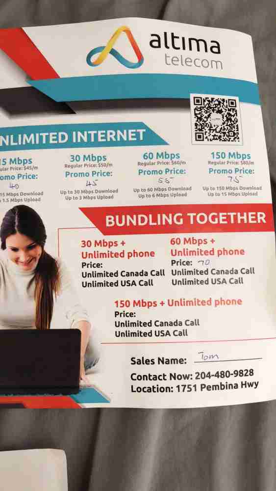 Altima网络价格优惠 套餐包括75兆网络,加拿大国内电话免费接听和拨打,国内各地方央视频道 客服都是中国人,跟踪服务或者咨询服务会方便很多 我们的折扣期是一年 联系人:Tom Song 联系电话:204-583-6514 微 ...