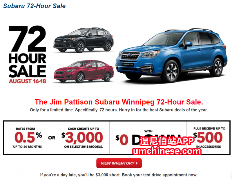 斯巴鲁华人销售:Jax 车行地址:1496 Regent Avenue West, Winnipeg, MB R2C 3A8 联系电话:204-955-0537 微信:sunyujun The Jim Pattison Subaru Winnipeg 72-Hour Sale 仅限本周四至周六! 年中最强 ...
