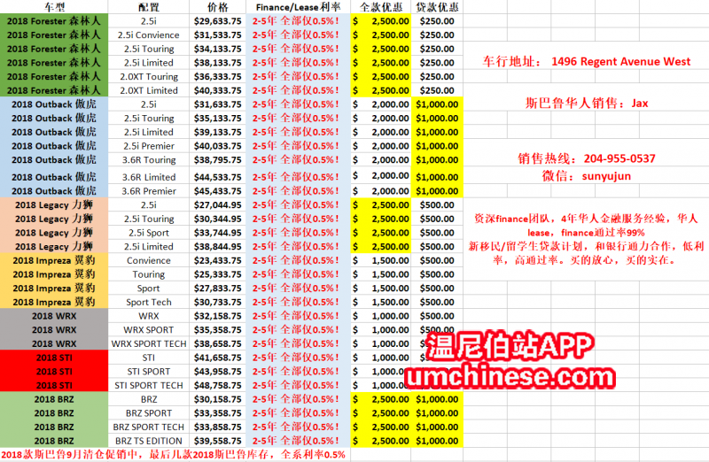 资深finance团队,4年华人金融服务经验,华人lease,finance通过率99% 新移民/留学生贷款计划,和银行通力合作,低利率,高通过率。买的放心,买的实在。 另有更多二手车,持续更新,欢迎前来咨询。 斯巴鲁华人销售:Jax 车行地址:1496 Regent Avenue West, Winnipeg, MB R2C 3A8 联系电话:204-955-0537 微信:sunyujun 我们尊重每一个客户,购车价格公开,透明,让消费者买的放心,买的明白。 我们尊重每一个客户,我们不强制客户买车并对客户施压,订金可退,若有其他原因取消买车,不克扣客户订金。 我们尊重每一个客户,只要有购车意愿,我们愿为客户展示价格上最大的诚意,帮助客户节省购车成本。 热情的服务,强大的维修售后团队,解决一切关于用车的疑惑和障碍。 Jim Pattison Subaru Winnipeg 二手车优势 30 Day Powertrain Guarantee 三十天动力总成保修 Carproof Vehicle History Report 提供完整的汽车历史保养维护报告 Detailed Cosmetic Reconditioning 细致的内饰清理/翻新 Comprehensive Mechanical & Safety Inspection 全面机械结构安全检验检测 14 Day Owner Exchange Program 14天汽车置换计划 Lien Free Guarantee 所有权保障 Free Shuttle 支持全城免费接送看车 营业时间: 周一至周二:上午八点-下午九点 8:00-21:00 周三至周四:上午八点-下午六点 8:00-18:00 周六: 上午九点-下午五点 9:00-5:00 |