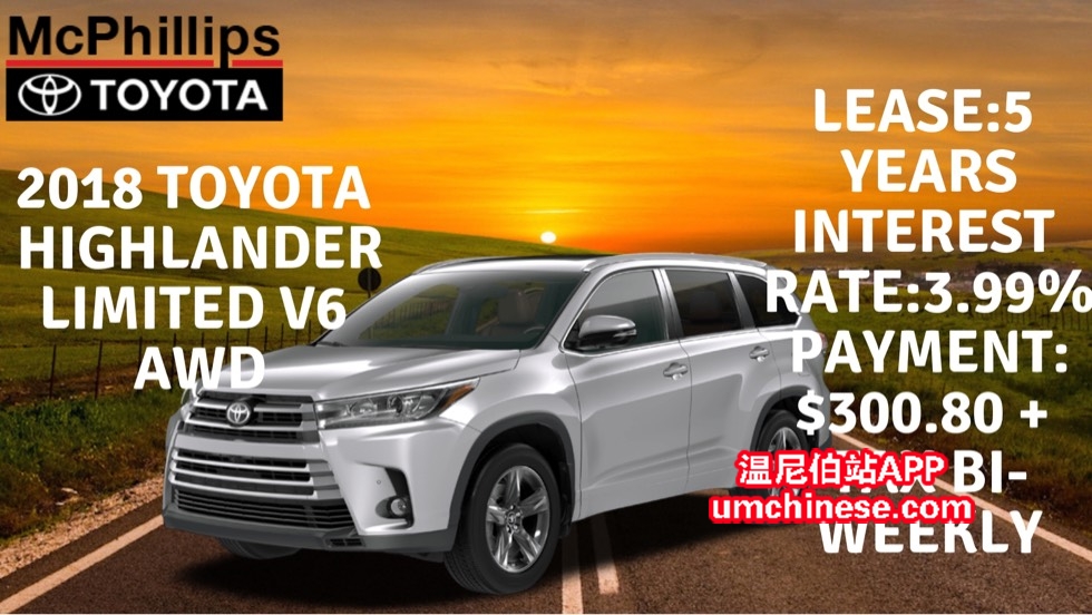 LEASE 新车今日特惠! (**2018丰田汉兰达顶配V6四驱**) (**S874165**) 这台车今日只要 (**$300.80每两周 **利息3.99%**5年Lease**) O.A.C. 加税. 现金(**$51768.68**)加税. 折扣:直减$1500 赠送:远程电动打火 ...