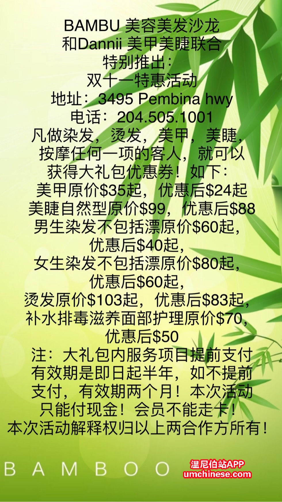 BAMBU 美容美发沙龙,Dannii美甲美睫以及按摩师刘师傅联合推出特别优惠十一月!有参与就有大礼包相送!点开就是惊喜!老铁们,转!