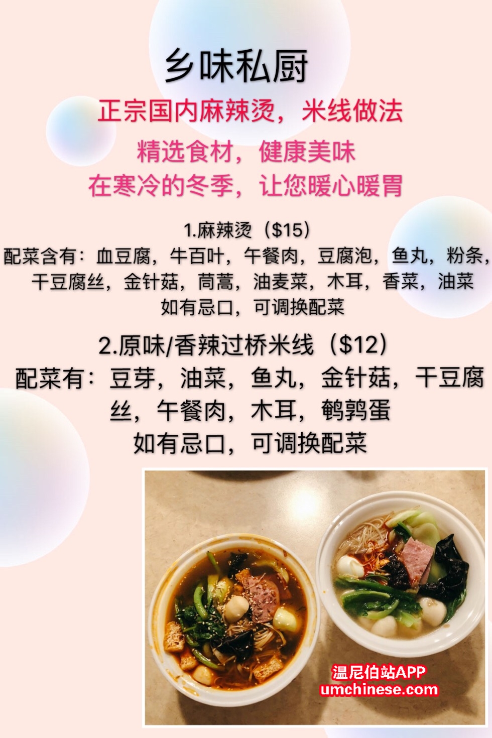 所有汤底都是用三十多种香辛料调制而成,食材全部干净和新鲜。寒冷的冬天里来上一碗,瞬间暖胃也暖心。欢迎大家订餐