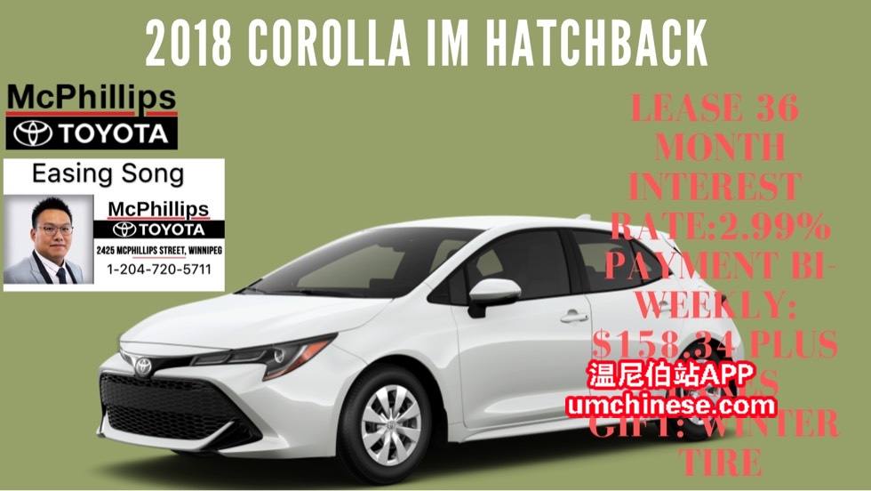 LEASE 新车今日特惠! (**2018丰田卡罗拉iM基础款 **) (**J554974**) 这台车今日只要 (**$158.34每两周 **利息2.99%**36个月Lease**) O.A.C. 加税. 现金(**$21,873.70**)加税. 欢迎今天给我打电话:204-720-5711 ...