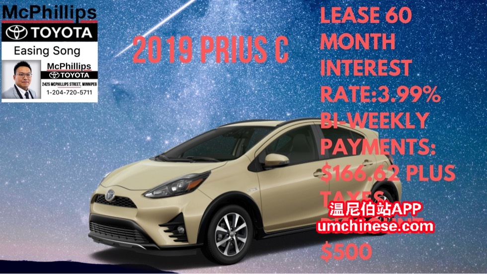 LEASE 新车今日特惠! (**2019丰田普锐斯C 精英款 **) (**1621037**) 这台车今日只要 (**$166.62每两周 **利息3.99%**60个月Lease**) O.A.C. 加税. 现金(**$27,763.70**)加税. 欢迎今天给我打电话:204-720-5711 ...