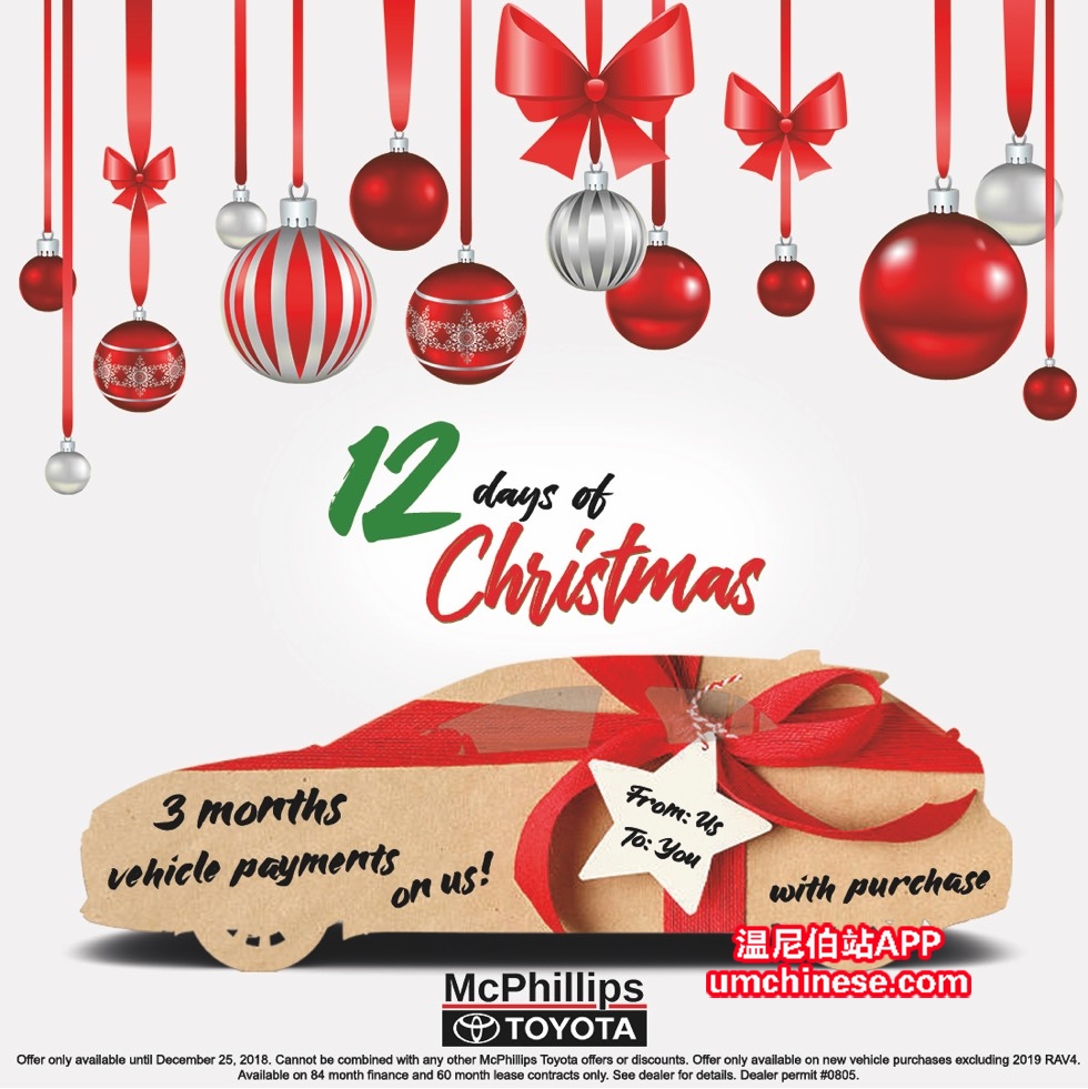 McPhillips Toyota的圣诞12天折扣再次来临! 从现在到圣诞节期间, 我们免去你头三个月新车的账单. 我们给你的礼物就是直到2019年你都不需要付账单并且你将驾驶一辆让圣诞老人都妒忌的2019款丰田新车! 这个折扣直到 ...