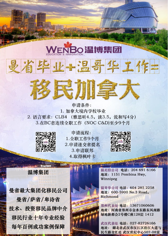 【曼省毕业+温哥华工作=移民加拿大】要求加拿大境内学校毕业,CLB 4,C/D类连续全职工作9个月。温博集团为您打开加国一扇门,工作在美丽的卑诗省,开启人生另一种精彩!温博集团(温尼伯)(温哥华)(武汉)(郑州 ...