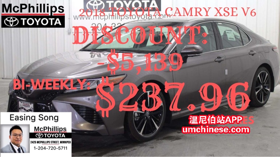 LEASE 2018丰田凯美瑞XSE V6新车特惠! (**2018 Toyota Camry XSE V6**) (**U004065**) 这台车今日只要 (**$237.96每两周 **利息0.99%**36个月Lease**) O.A.C. 加税. 现金(**$38,844.70**)加税. 欢迎今天给我打电 ...