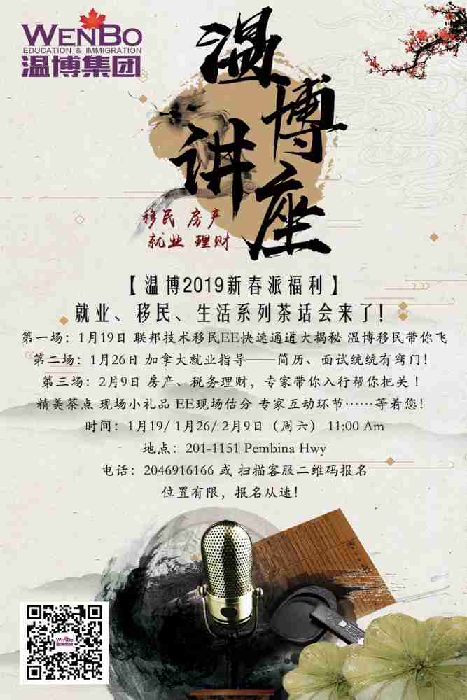 【温博2019新春福利大发送】就业、移民、生活系列茶话会来了!每周六早11点! 第一场:1月19日联邦技术移民快速通道 Express Entry讲座 ——6个月移民项目,让你的移民速度飞起来! 第二场:1月26日加拿大就业指 ...