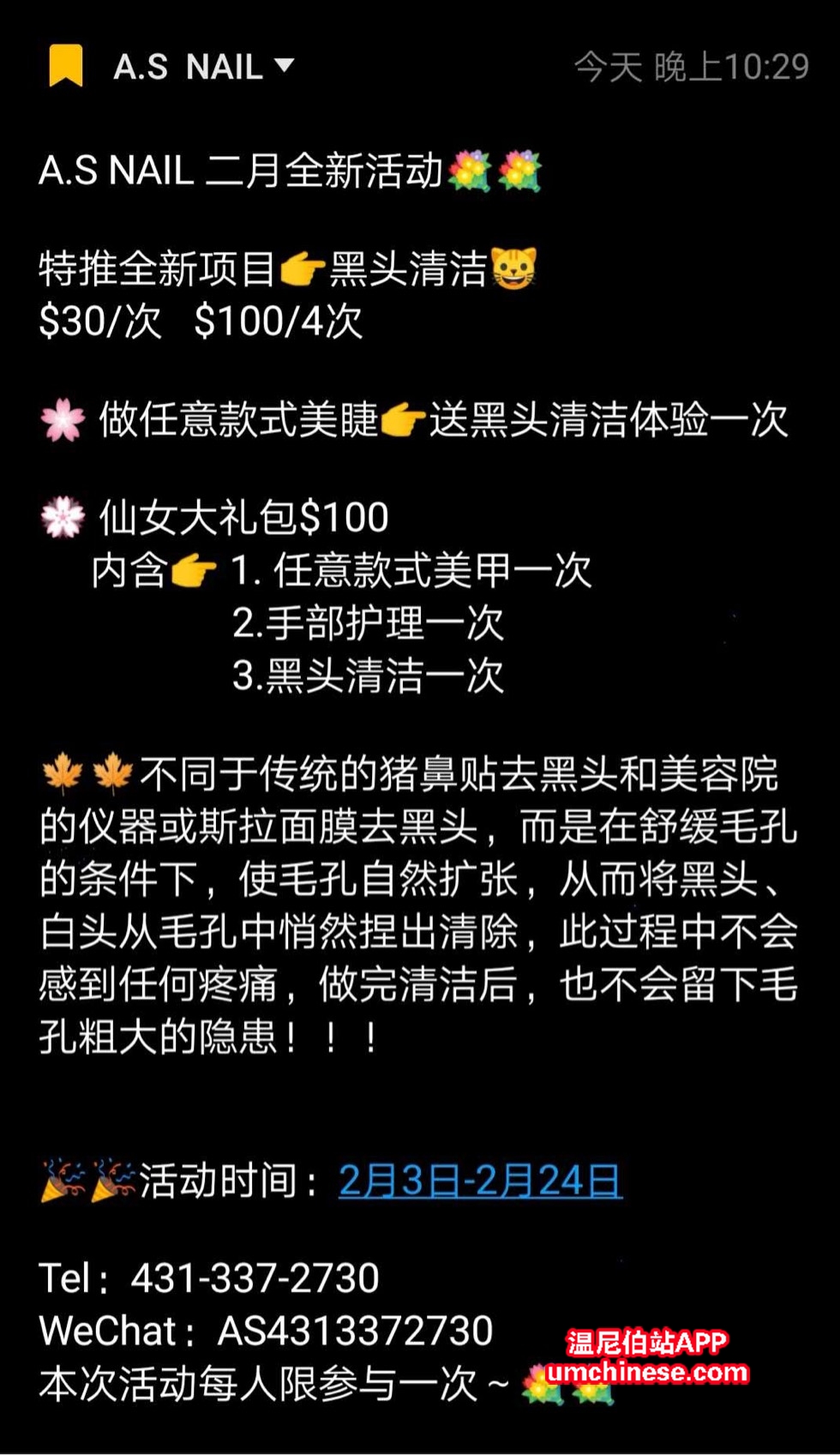 本着每月都要给我仙女们送福利的原则,二月份的最新活动出炉啦~~~~ 应各位仙女大佬的号召,积极开启啦新项目 黑头清洁。价格也是异常的实惠! 本月做任意款美睫都赠送黑头清洁一次哟~~~ 话不多说,详情 ...