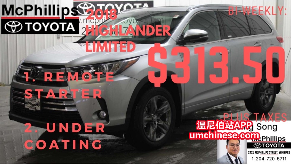 LEASE 2018丰田 汉兰达 顶配今日特惠! (**2018 Toyota Highlander Limited **) (**S886775**) 这台车今日只要 (**$313.50每两周 **利息3.99%**60个月Lease**) O.A.C. 加税. 现金(**$51,980.58**)加税. 欢迎今天给 ...