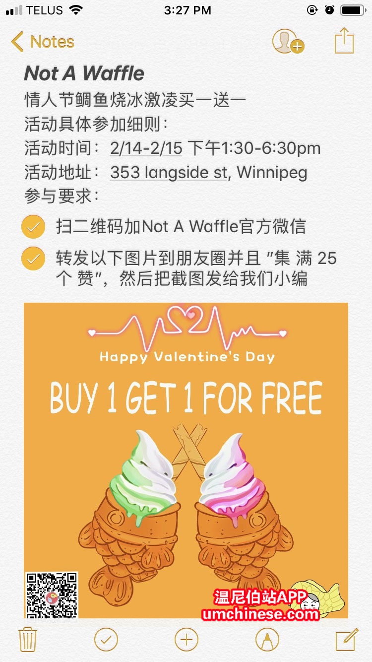 Not A Waffle 情人节鲷鱼烧冰激凌买一送一 活动具体参加细则: 活动时间:2/14-2/15 下午1:30-6:30pm 活动地址:353 langside st, Winnipeg 参与要求: - [x] 扫二维码加Not A Waffle官方微信 - [x] 转发以下 ...