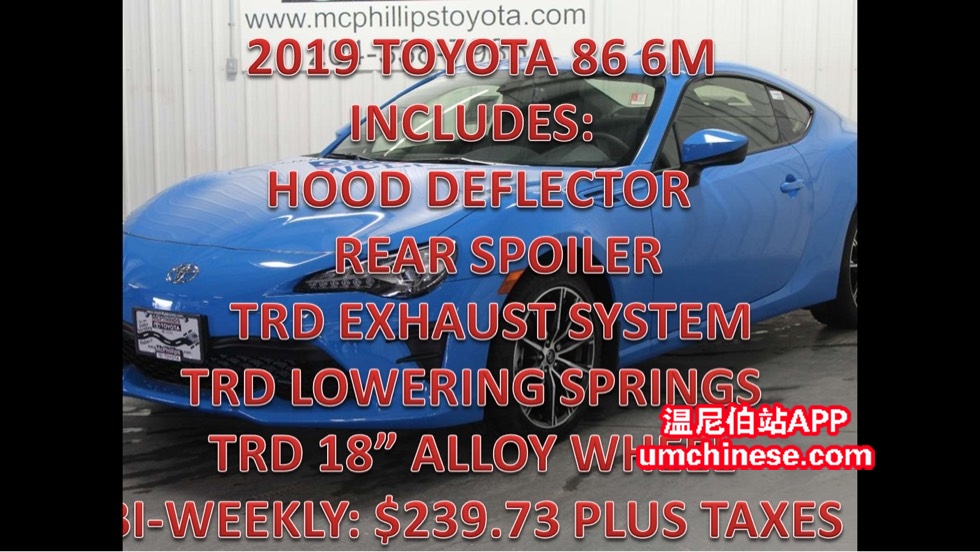 LEASE 2019丰田 86 6M 今日特惠! (**2019 TOYOTA 86 6M**) (**9701366**) 这台车今日只要 (**$239.73每两周 **利息4.49%**60个月Lease**) O.A.C. 加税. 现金(**$36,904.21**)加税. 欢迎今天给我打电话:204-720-5 ...