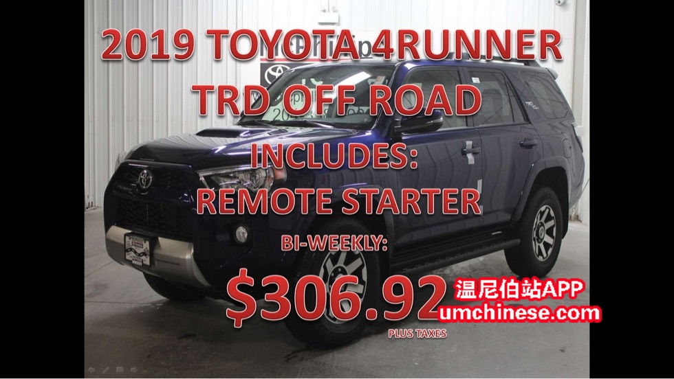 LEASE 2019丰田4RUNNER TRD OFF ROAD 今日特惠! (**2019 TOYOTA 4RUNNER TRD OFF ROAD**) (**5624089**) 这台车今日只要 (**$306.92每两周 **利息5.29%**60个月Lease**) O.A.C. 加税. 现金(**$51,353.48**) ...