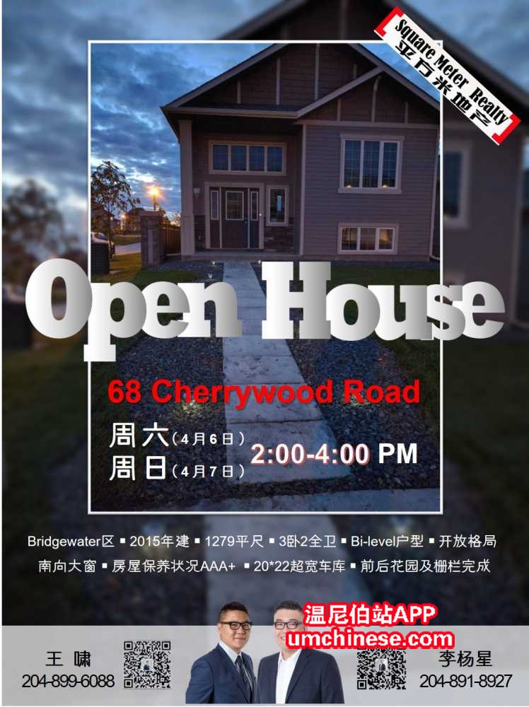 68 Cherrywood Rd 该独立屋坐落于Bridgewater trails,2015年建 Bi-level错落式户型,开放式布局,1279平方尺,3室2全卫,配有朝南加大窗户,整座房屋宽敞明亮,采光极好! 厨房全不锈钢电器并配置加长操作台。独特 ...