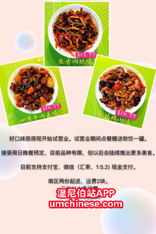 好口味私厨来啦!量大味好!东北小鸡炖蘑菇 选材绝不糊涂 吃完特别舒服 当你饿的咕噜咕噜叫 只要随时给我们一个call! 香菇鸡肉饭-$14.99 鱼香肉丝饭-$13.99 咖喱牛肉盖饭-$14.99 周日开始送餐,但目前品种有限,但 ...