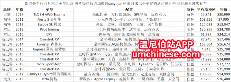 斯巴鲁车行 二手车信息报价汇总 更多图片详情欢迎加微信sunyujun详询 斯巴鲁华人销售:Jax 车行地址:1496 Regent Avenue West, Winnipeg, MB R2C 3A8 联系电话:204-955-0537 微信:sunyujun 所 ...