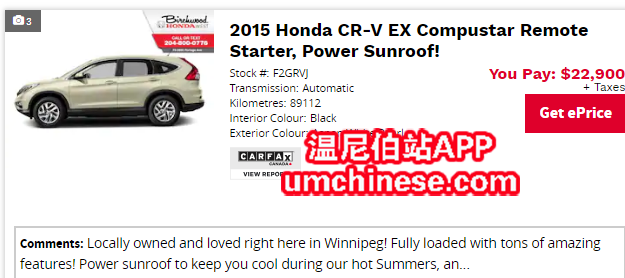 本地车 配有2.4 4缸发动机 4驱 天窗 倒车影像 蓝牙 加热前座椅 非常保值的车型,性价比高 满足家庭或温尼伯四季需求 买车送3年道路救援,轮胎轮毂保修 - 这台车通过了高标准的Birchwood Safety 级别的检测, ...