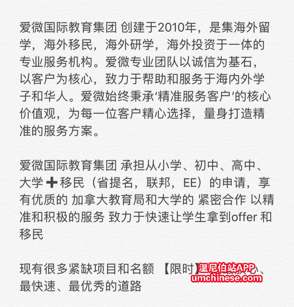 爱微国际教育集团 创建于2010年,是集海外留学,海外移民,海外研学,海外投资于一体的专业服务机构。爱微专业团队以诚信为基石,以客户为核心,致力于帮助和服务于海内外学子和华人。爱微始终秉承‘精准服务客户’ ...