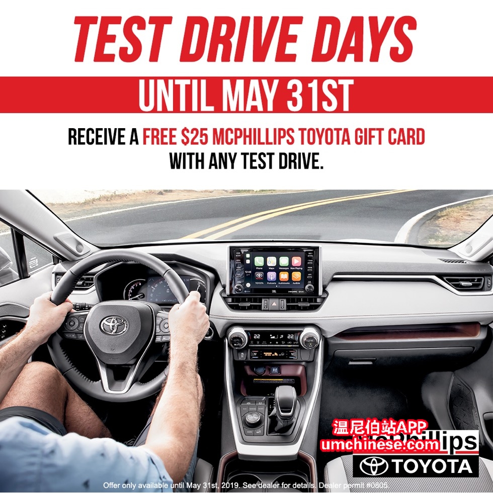 快来参加McPhillips Toyota的试驾日活动! 试驾任何在McPhillips 丰田的现车,都将获得一张价值25刀的McPhillips礼品卡。不管是丰田的新车,还是我们的二手现车都将参与本次活动。 快给我打电话吧! 204-720-5 ...