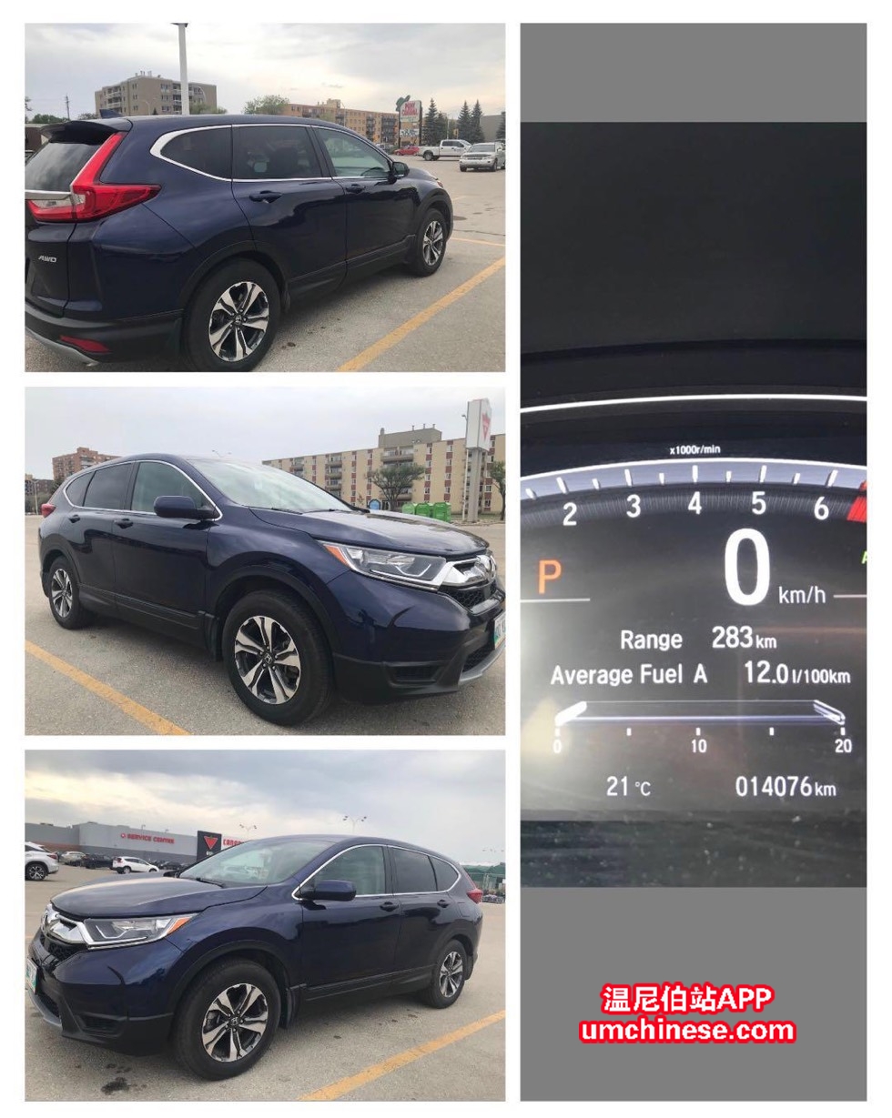 型號: 2017年 6月出廠,Honda CR-V LX 藍色。 4條用了一季的原廠雪呔,無碰撞,保養很好,剛走了14000公里,用作醫生在Winnipeg市內上班代步行車,現返回溫哥華工作求轉讓。價格: Cdn$26000 有意請聯絡梁小姐778-233 ...