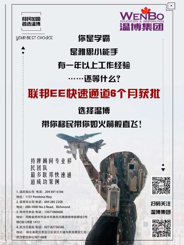 【温博🇨🇦集团】联邦EE快速通道,移民加国的首选之道!审批时间不超过六个月,半年get枫叶卡。🇨🇦EE下三个项目,总有一款适合你哟!下图扫码️致电204-691-6166📍 ...