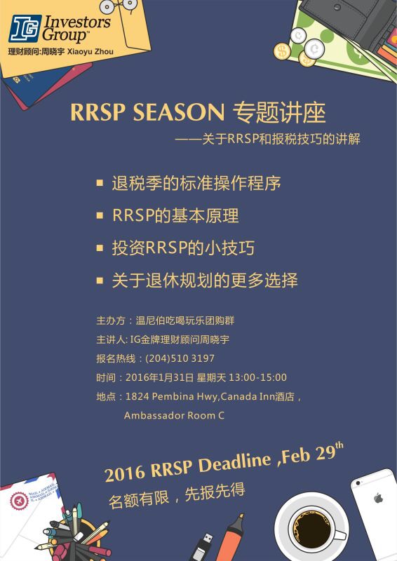 2016年RRSP Season 大型专题讲座正式开始报名了。 Investors Group金牌理财顾问 ...
