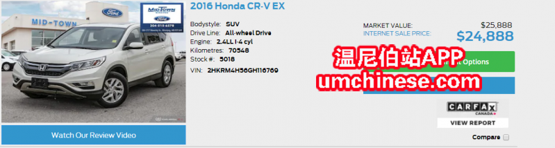 刚进店,高性价比,喜欢日系车的小伙伴。16年CRV EX 2.4L排量,7W KM。配置齐全,一键启动,倒车影像,四轮驱动。。。 详情咨询 Mid-Town福特 华人销售 James 电话:204-296-7891