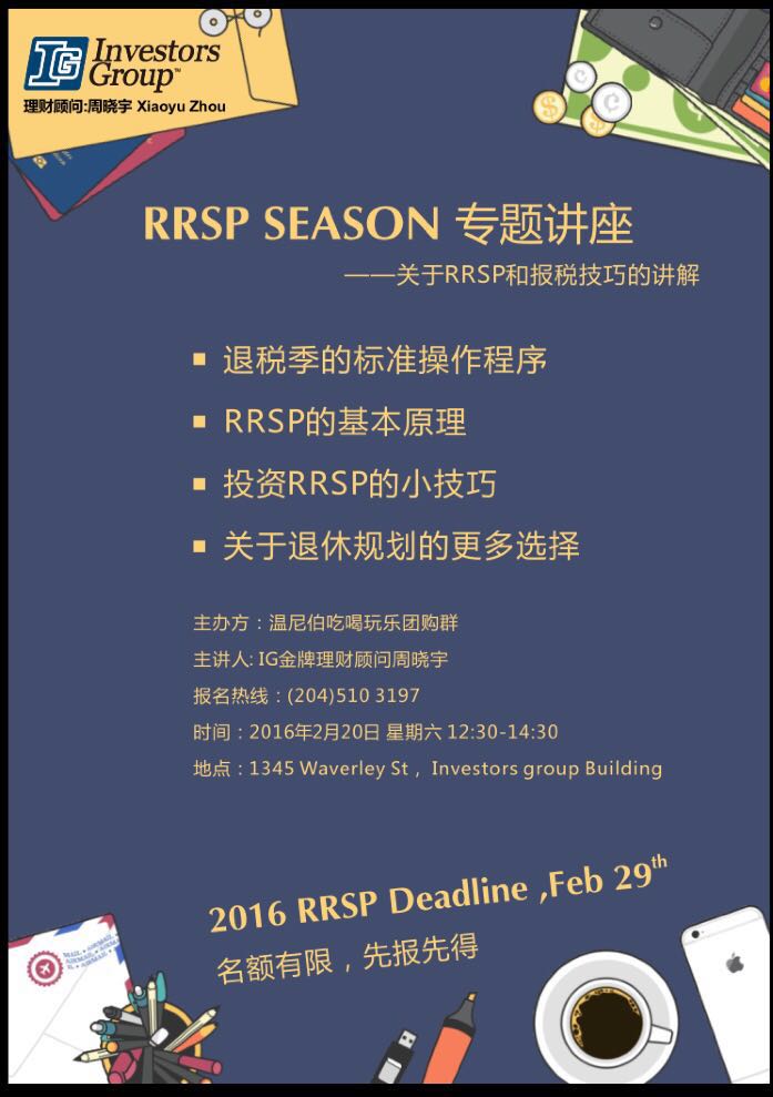 福利又来了!!!上一次RRSP讲座,座无虚席,因为场地和时间原因,有些朋友无缘参加!应大家要求,团购群决定再举办第二次讲座,以前错过了的朋友,请牢牢抓住这次机会!!! RRSP SEASON 专题讲座: 1.退税 ...