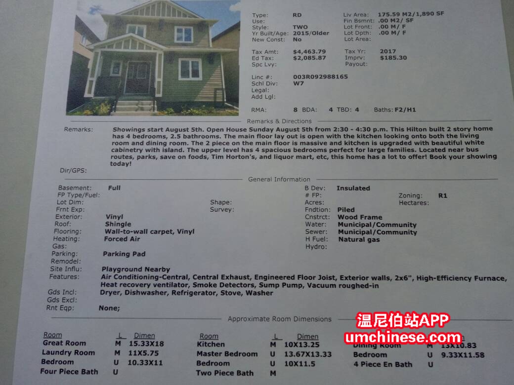 房屋地理位置:南区8 Bankfield Crescent,Winnipeg,门口就是公交站,曼大9分钟,银行餐厅3分钟。靠近学校,交通非常便利。 房屋基本介绍:房子建于2015年,房子楼上共4个房间,3个次屋,一个卫生间,还有一个带卫 ...