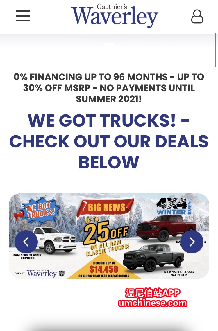 2月9-13吉普部分车型可达15% off,ram 1500部分车型可达25% off 0利息 微信:bono1993 电话:204 797 5247 Waverley Dodge Jeep Ram 1700A Waverley St, Winnipeg, MB R3T 5V7