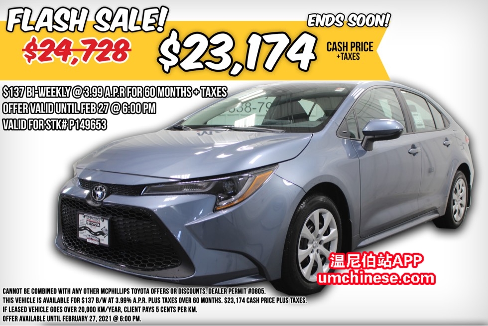 2021 TOYOTA COROLLA LE EASING’S FLASH SALE THIS CAR IS ONLY ASKING $23,174 PLUS TAXES WAS $24,728 PLUS TAXES LEASE TO OWN 5 YEARS, BI-WEEKLY: $137.00 PLUS TAXES VALID FOR STOCK NUMBER: P149653 FEATUR ...