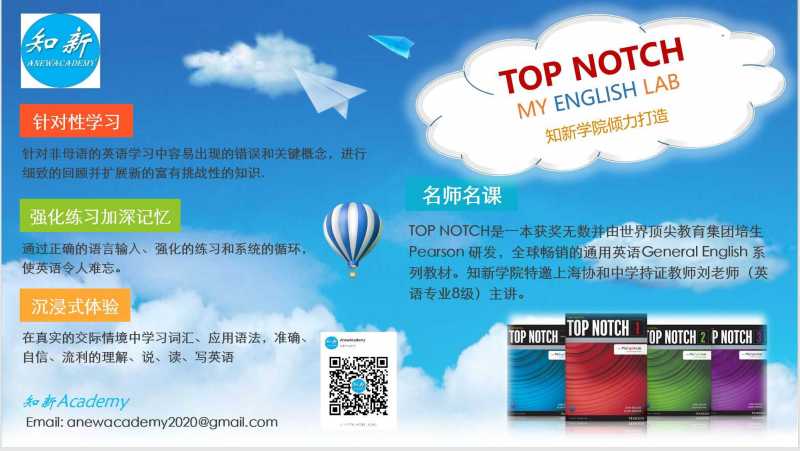 知新学院隆重推出Top Notch名师名课!Top Notch是一本获奖无数并由世界顶尖教育集团培生Pearson研发的全球畅销的通用英语系列教材。知新学院特邀上海协和中学持证教师主讲。对非母语的学员进行针对性教学,强化练习 ...