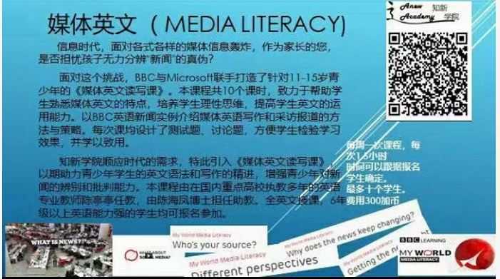 知新学院开办媒体英文课程的初衷就是要让孩子有自己的perception, 以及be critical. 这门15个课时的媒体英文课,培养孩子的写作和阅读能力,并学会针砭时弊,有兴趣者请垂询以下微信号。