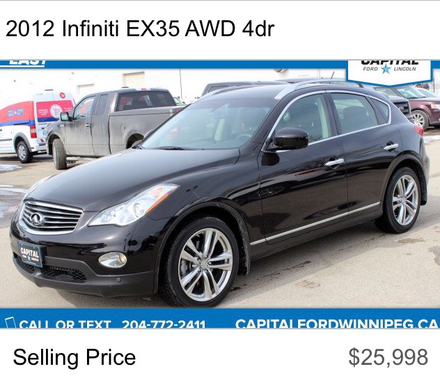 2012 Infiniti EX35,仅2.9万公里电动真皮座椅、天窗、导航。。。 电话:204-898-7766 微信:JackZhangCanada 地址:555 Empress Street (紧邻PoloPark东侧)
