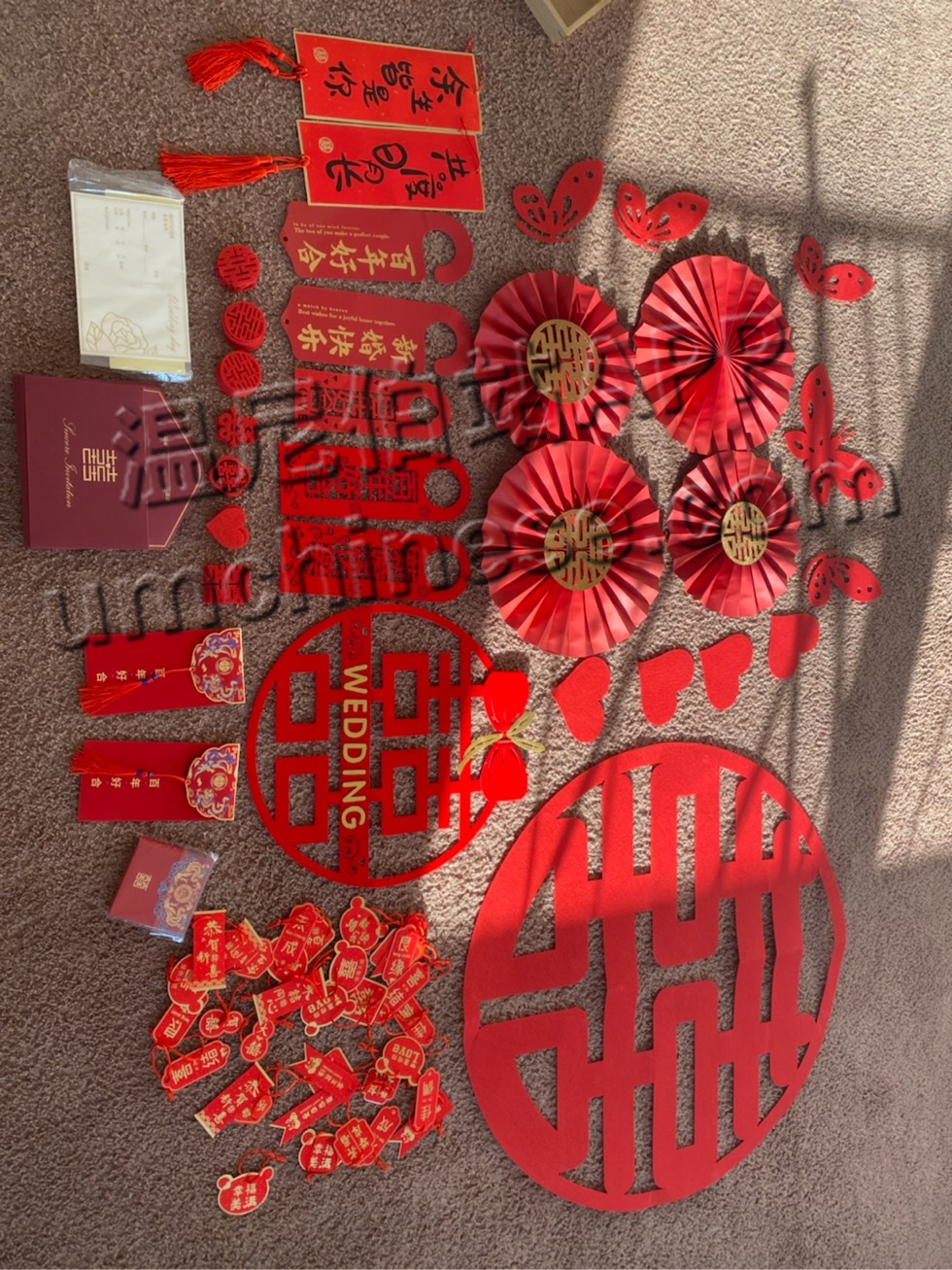 婚礼装饰品 包括无纺布喜字、门把手装饰若干、墙上装饰若干、手抛喜若干、喜字挂饰若干、精致千元红包两个、小红包若干、喜宴请帖*24、 伴手礼袋子*24、喜字盖布90*150cm。 全出$20 单独够买请私信